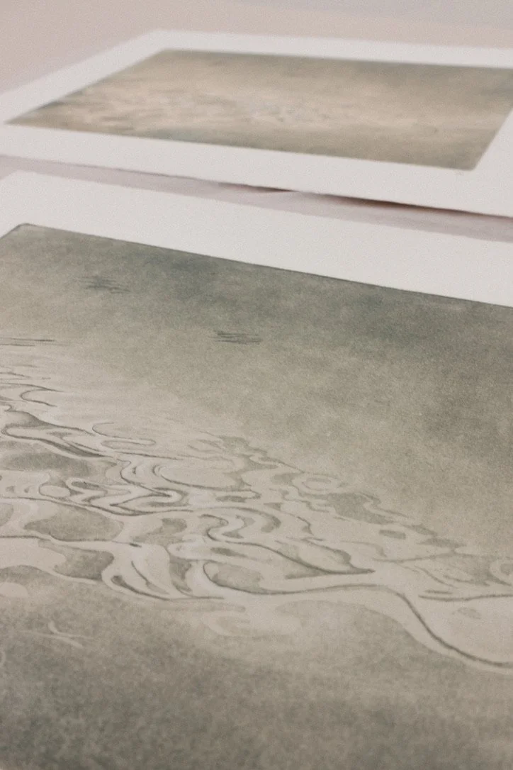 A colour variation of the editioned etching ‘Water at Dawn’. The pink shading on these vary.